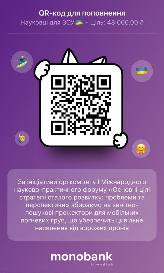 За ініціативи оргкомітету І Міжнародного науково-практичного форуму «Основні цілі стратегії сталого розвитку: проблеми та перспективи» збираємо на зенітно-пошукові прожектори для мобільних вогневих груп, що вбезпечить цивільне населення від ворожих дронів.